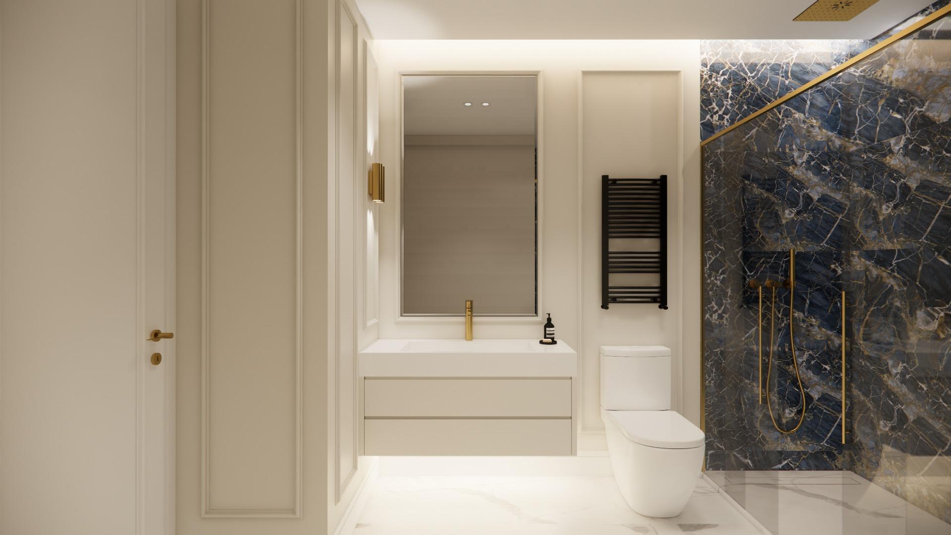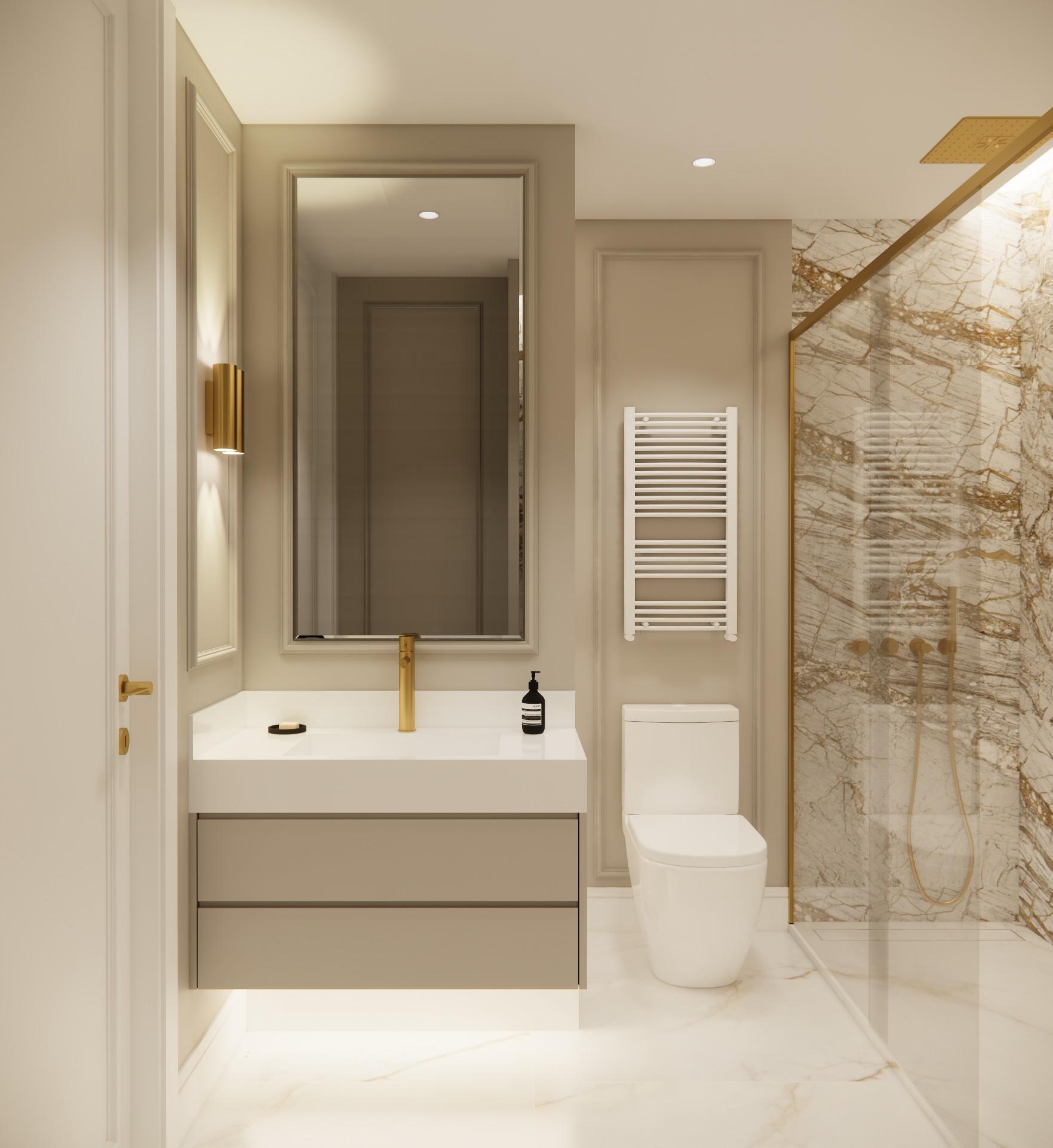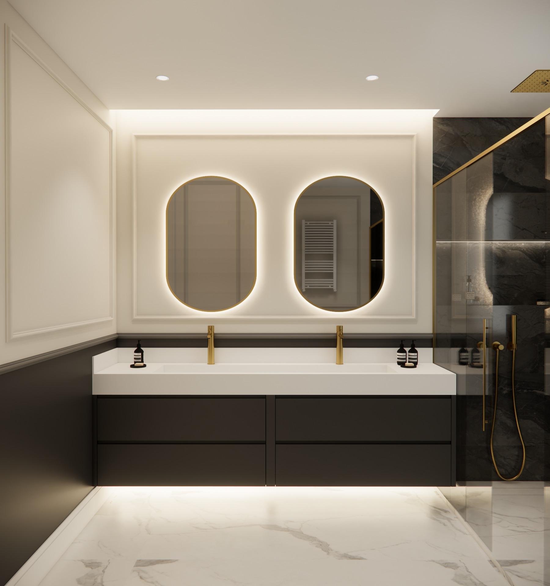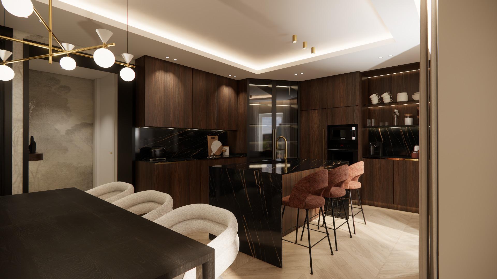 The renovation, carried out by the renowned ARCTEMPUS interior design studio, showcases premium materials and refined finishes: high-resistance flooring, individual gas heating, lacquered carpentry, embedded LED lighting, and bathrooms with natural stone finishes and brushed gold fixtures. The kitchen features custom cabinetry, black designer countertops, and integrated top-brand appliances.