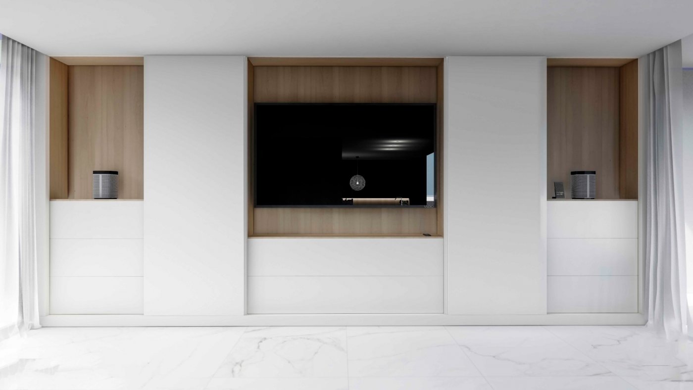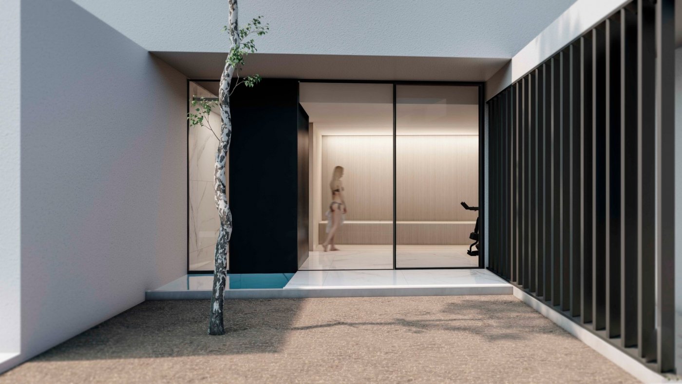 Desde la entrada principal se accede a la planta baja directamente al vestíbulo, donde se ubican la cocina, el salón y el comedor en un mismo espacio. Desde el vestíbulo se puede acceder a la planta superior y a la planta baja mediante las escaleras o el ascensor. El salón y la cocina tienen acceso directo a la piscina y a la zona de ocio exterior con barbacoa.