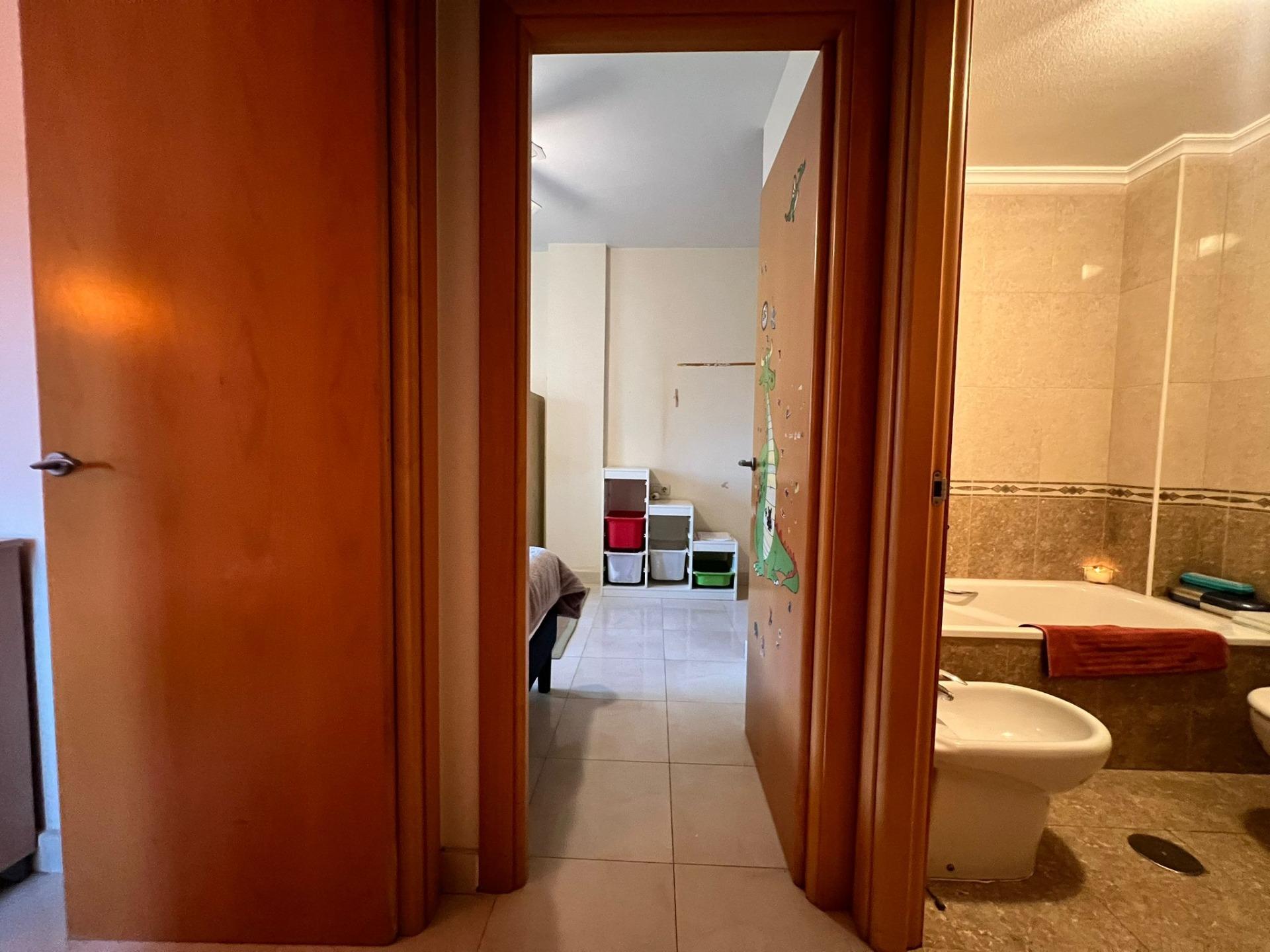 This property is located on three floor. Property consists of three floors: groundfloor with its own entrance to the house and a big room with water installation On the first floor you have two bedrooms and one bathroom. On the second floor you have your livingroom and another entrance through terrace and communal areas. On the first floor you have two bedrooms and one bathroom. On the second floor you can also find a chimney and kitchen as well as a south-facing balcony. On the third floor you have your masterbedroom, a bathroom and entrance yet to another balcony and solarium. From solarium you have fantastic views to the sea and the community areas. In the community, you have a beautiful pool and two parking places in front of the house.