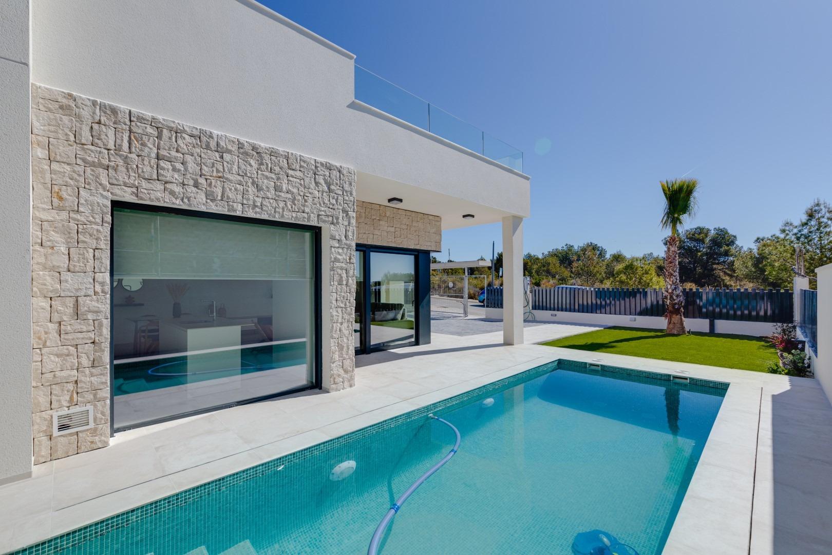 All villas include 3 bedrooms, 2 bathrooms, living room with equipped kitchen, sun terrace, garden with parking area and private pool.