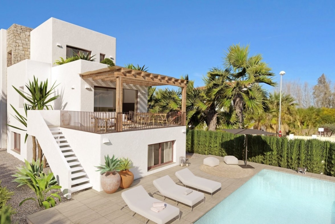 Na zewnątrz znajdzie się basen o powierzchni 32 m², dwie drewniane pergole i wiata samochodowa. Lokalizacja jest spektakularna, biorąc pod uwagę, że Rabdells Beach to naturalna plaża z piękną, krystalicznie czystą wodą, niemal nietknięta przez człowieka, która dzięki swojemu ustronnemu położeniu w otoczeniu natury, zyskuje wyjątkowy urok. Zaledwie kilka metrów dalej znajduje się popularny kurort Oliva Nova z wszystkimi udogodnieniami i bogatą ofertą rekreacyjną.