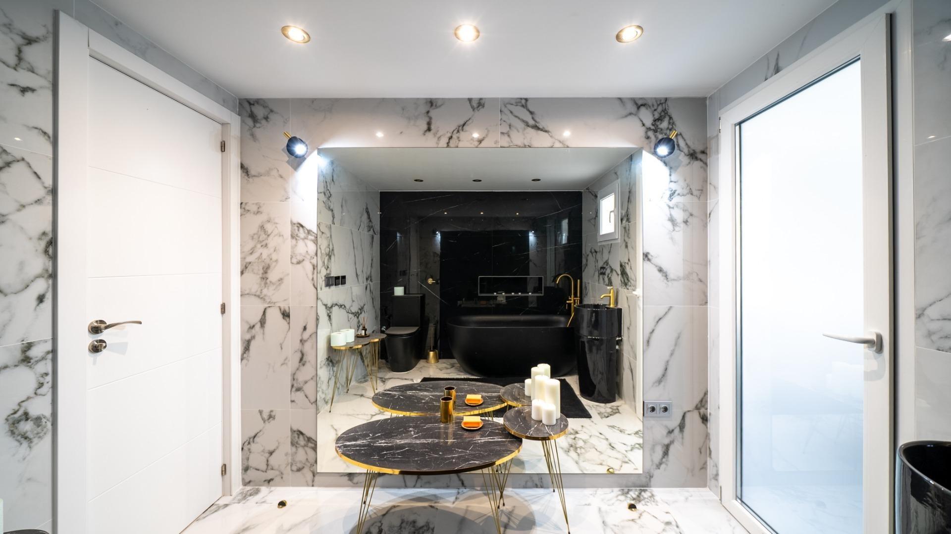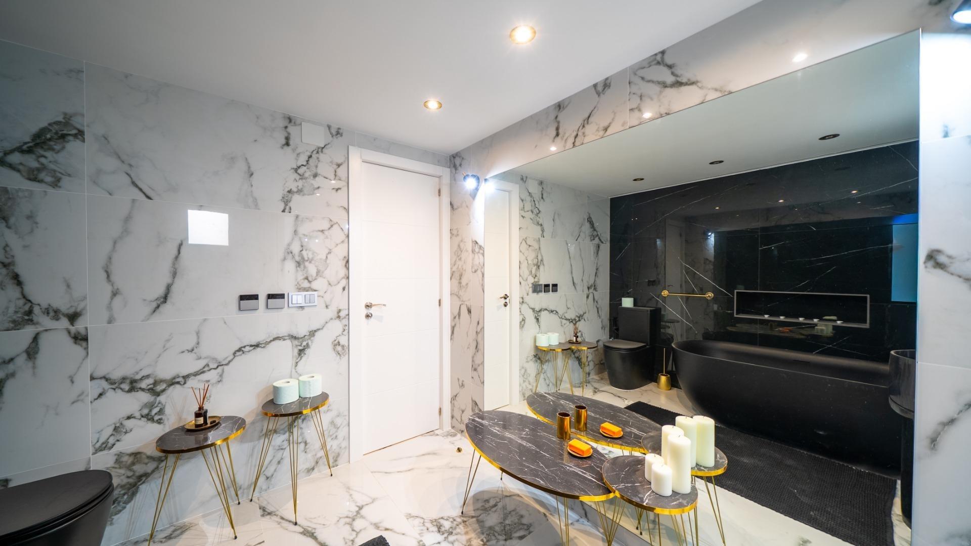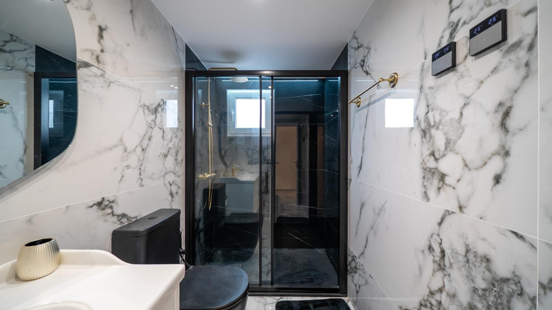 - Two bathrooms: one with shower, one with bathtub, with luxury design and heated walls and floors.