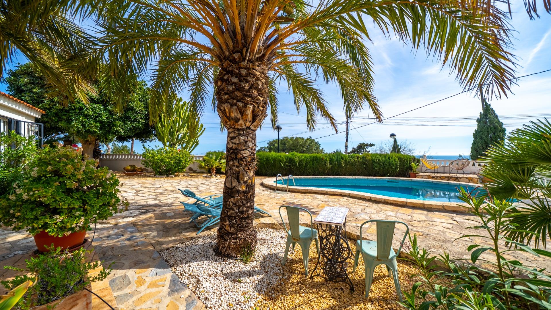 A cozy villa with 3 bedrooms, 3 bathrooms, living-dining room, and fireplace. Three spacious terraces offer stunning sea views on one side and mountain views on the other. A large and well-maintained garden with a wide variety of plants (olive trees, lemon trees, and numerous palm trees) includes a barbecue area, private pool, and outdoor shower with hot water. It also features a covered garage for one car and covered parking spaces for two. It has automatic gates and a laundry room. The house has been completely renovated.