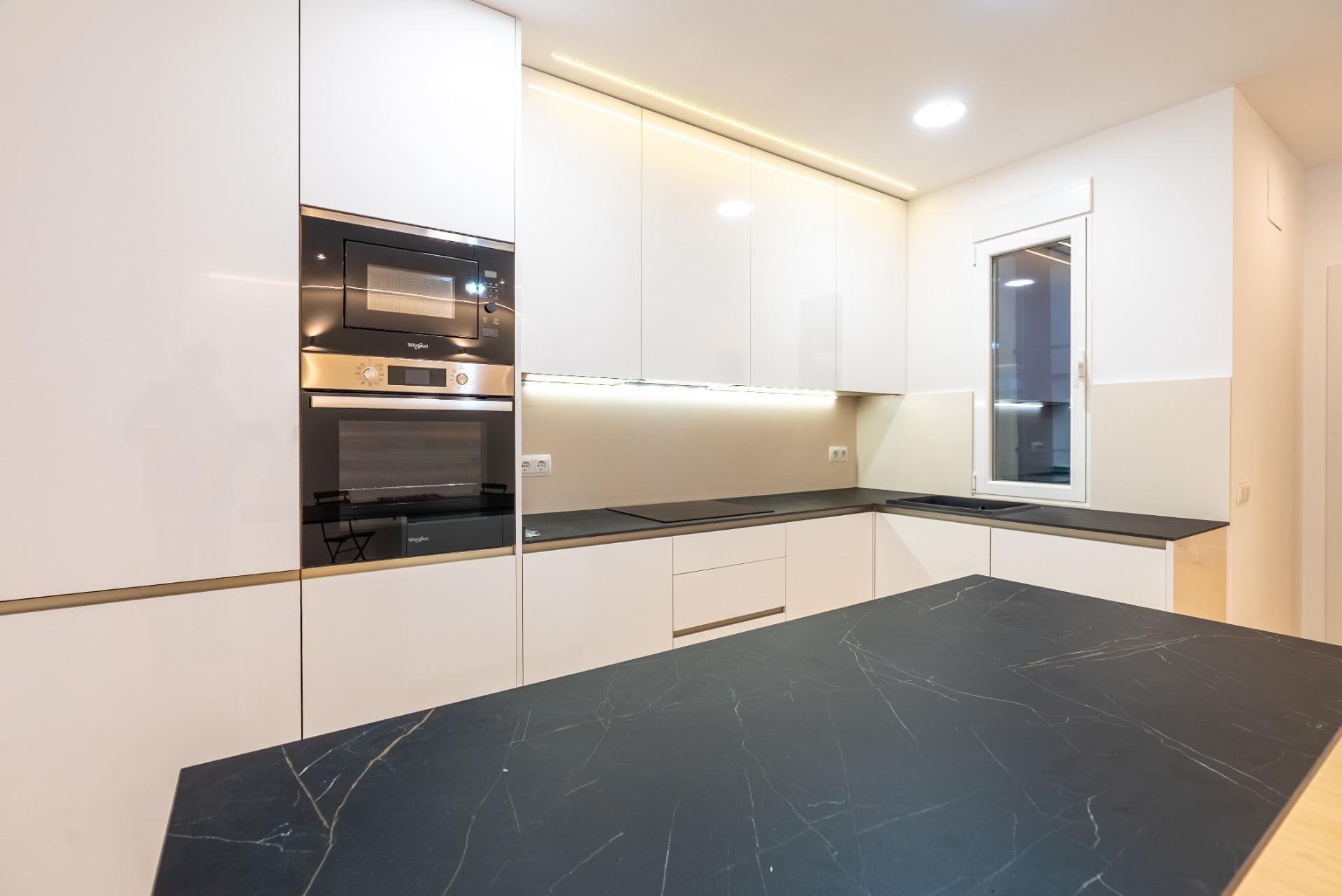 The property has been refurbished using top-quality materials: porcelain tile flooring, acoustic insulation with rock wool, double-glazed windows, LED lighting, white lacquered doors, and a designer kitchen with Ceratop porcelain countertop, Blum soft-close cabinetry, and Whirlpool appliances. It also includes programmable low-consumption electric radiators and an 80L electric water heater.