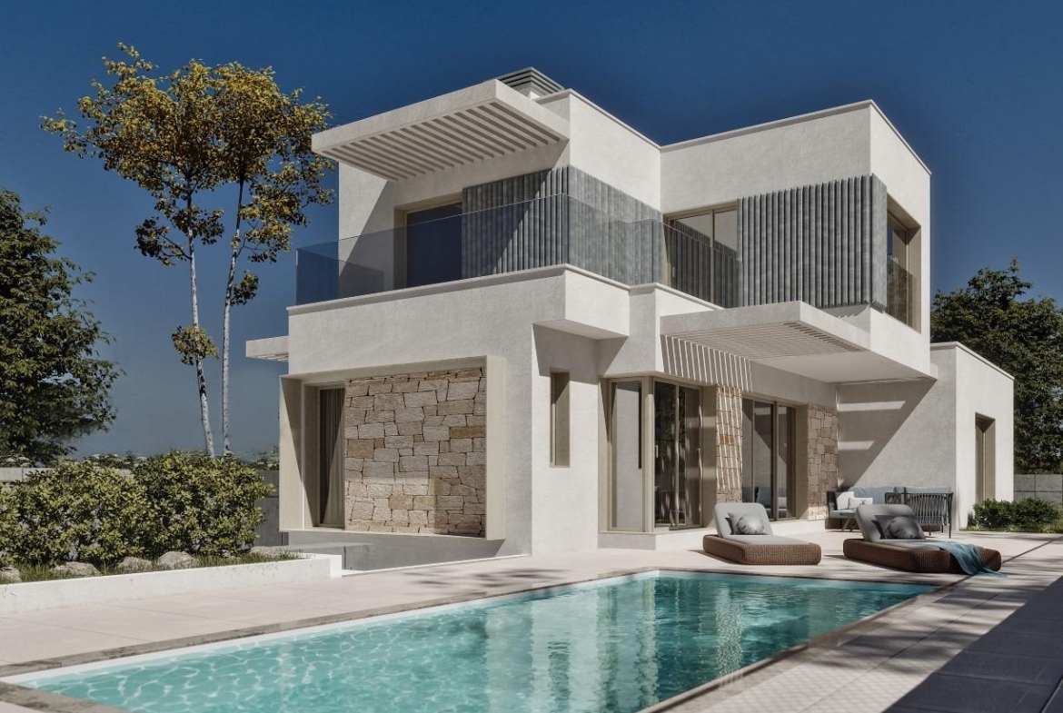 All include 3 bedrooms, 3 bathrooms, 1 toilet, living room with equipped kitchen, large terraces, basement garage, garden and private pool.
