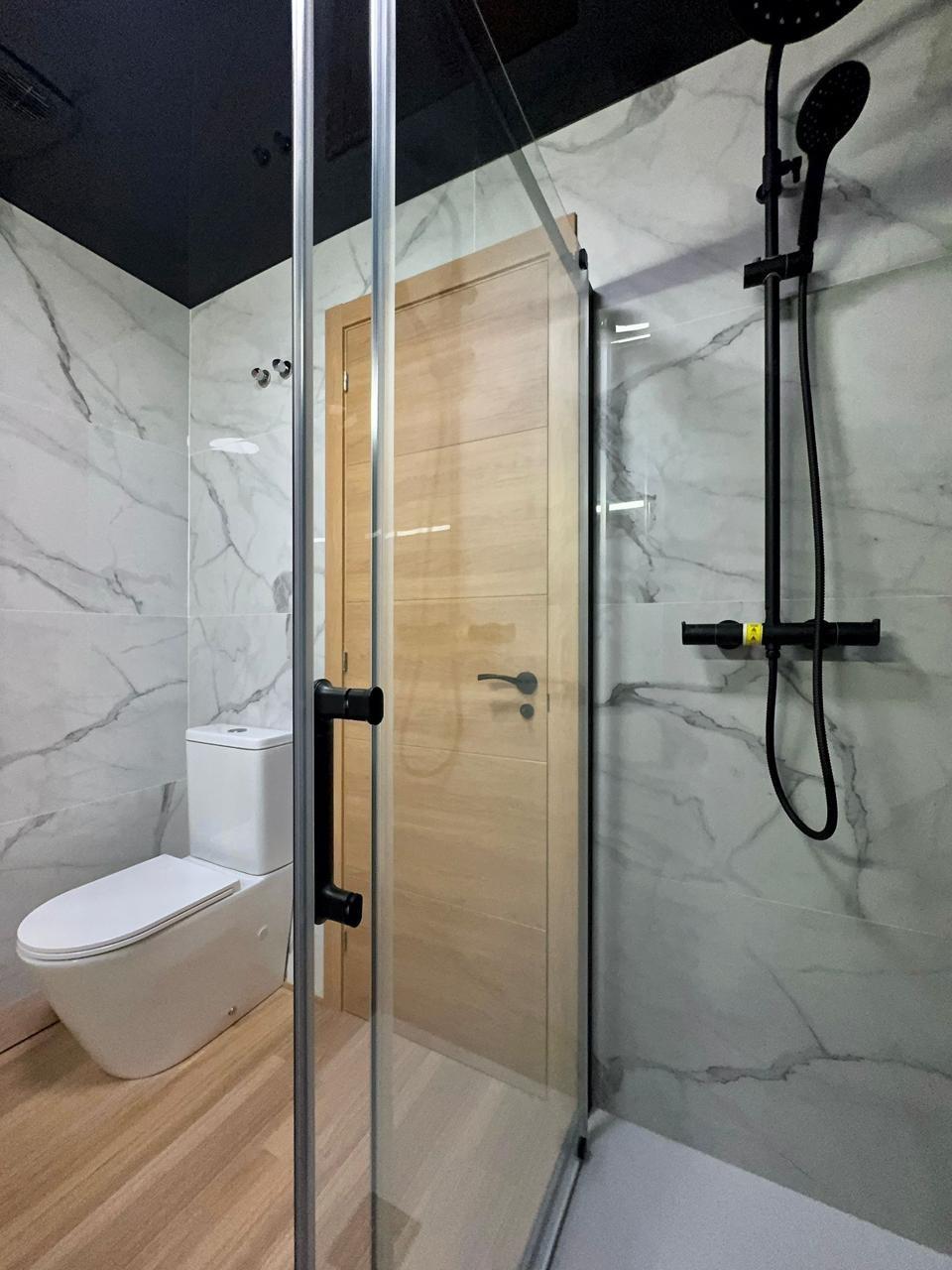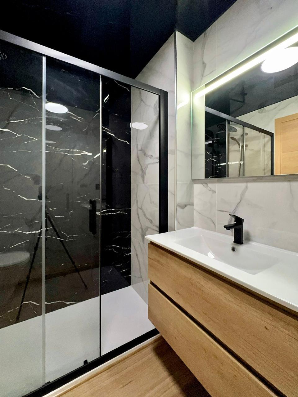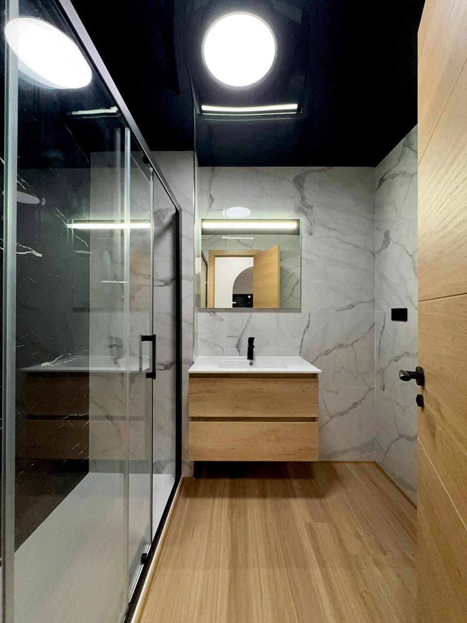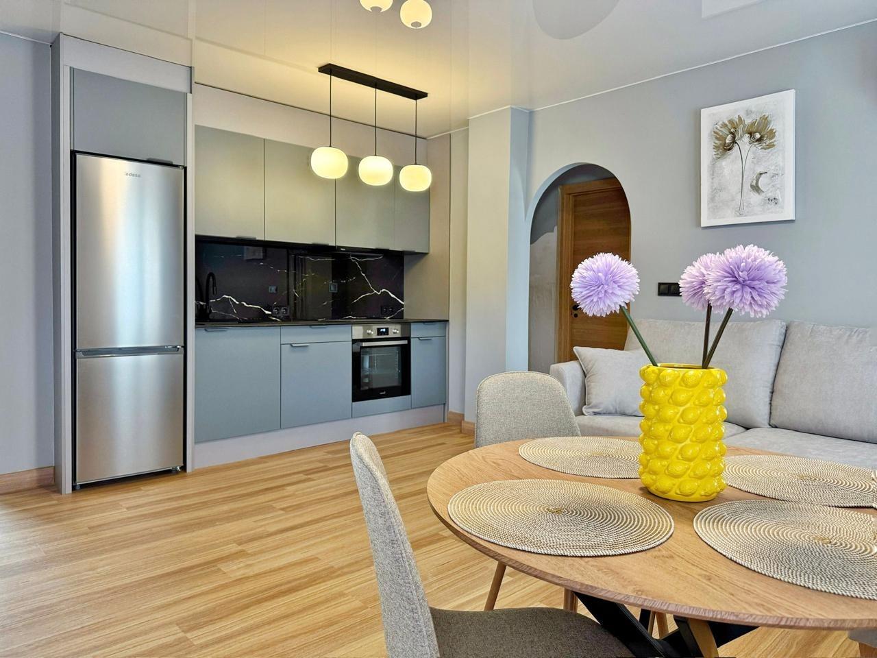 • modern renovation with stretched ceilings, quartz-vinyl flooring, and designer decorative details;
