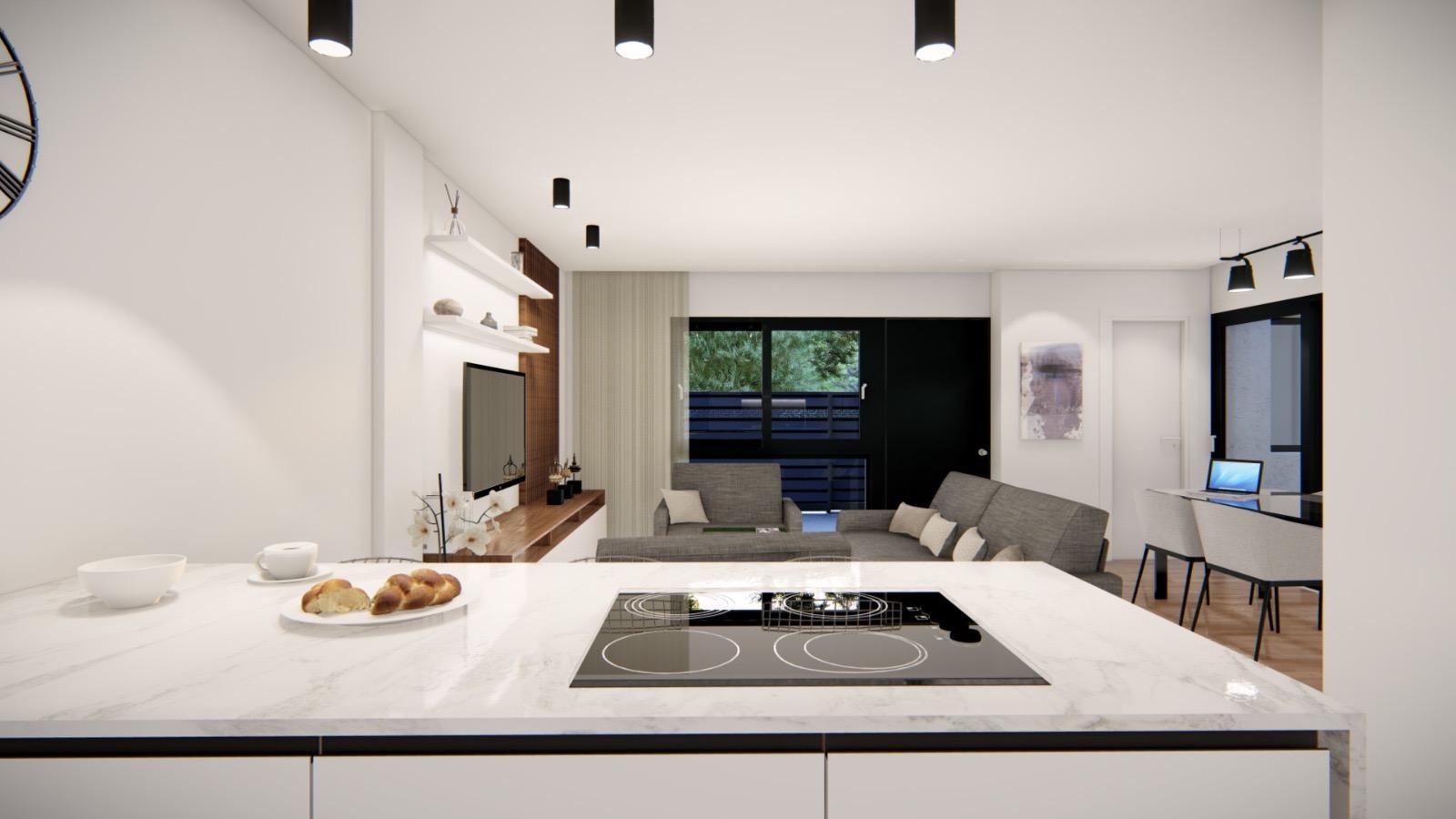 Each home has 2 bedrooms and 2 full baths, with an option for 3 bedrooms and 3 baths. The house has been designed with a contemporary style and an open housing concept, which consists of a fitted kitchen and a living-dining room.
