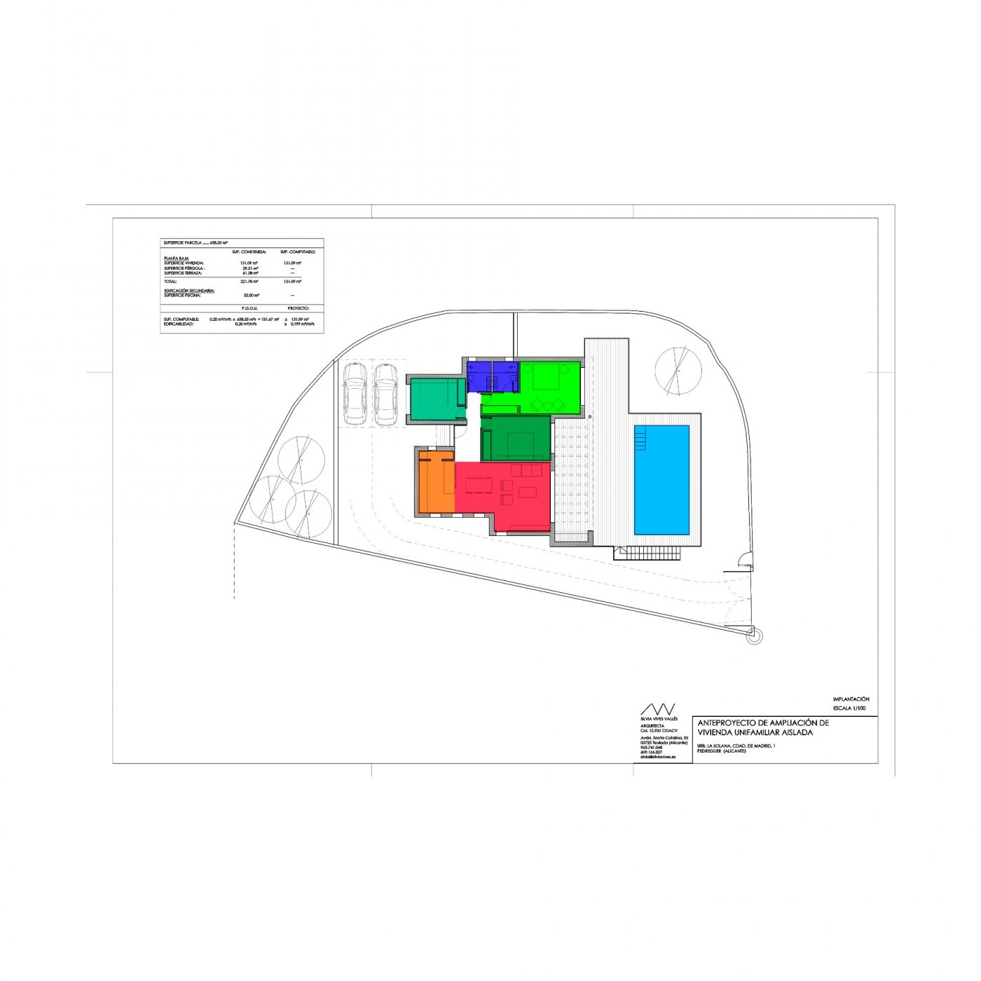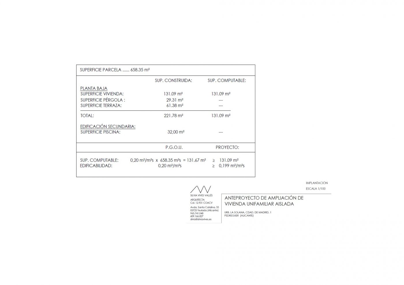 This property consists of 221,78 m² of living space on one floor, 61,38 m² of terraces, 29,31 m² of pergola, and 32 m² of swimming pool on a plot of 658,35 m².